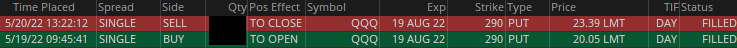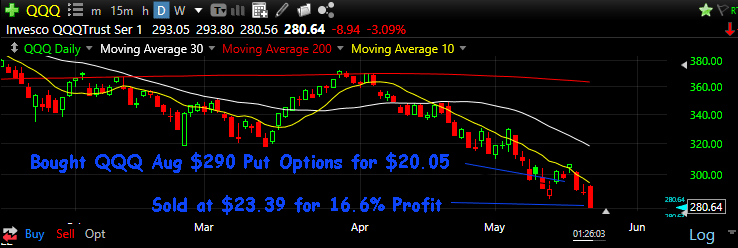 Latest Pick Made: $1,670.00 on QQQ August $290 Put Options on 20 May 2022 in just 2 days! (calculated based on 5 contracts!)